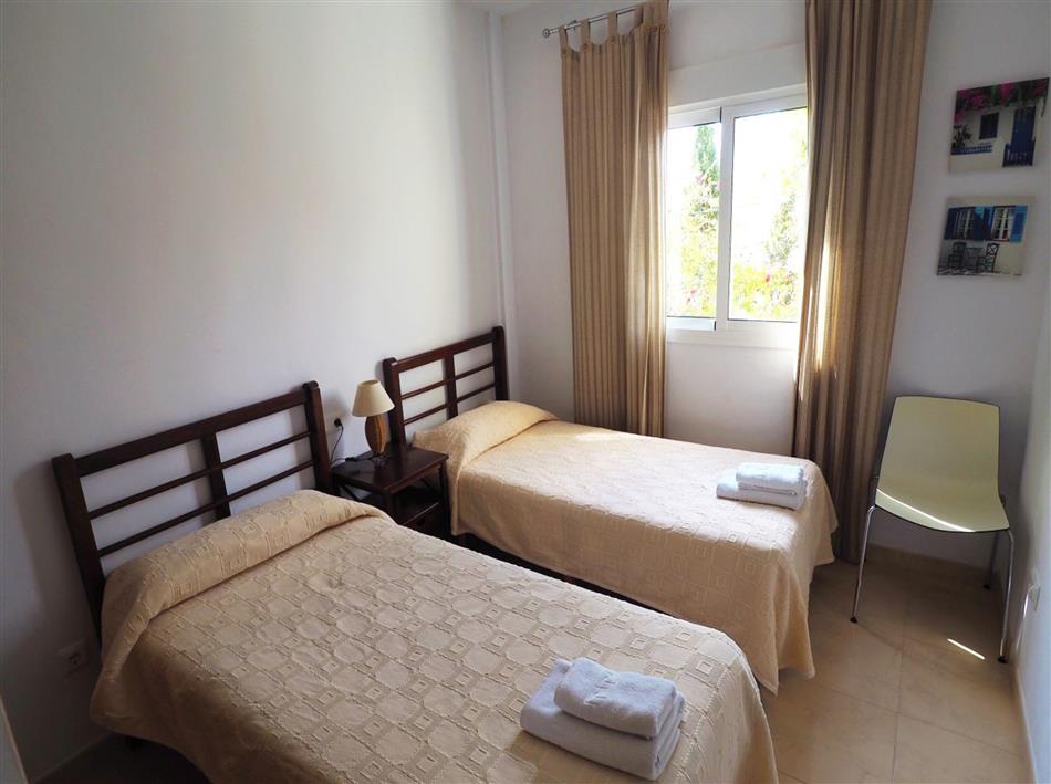 The apartment has an open dining and living area with French windows opening out to the private terrace with outside table for al fresco dining and separate kitchen. There is a large, airy king-size double bedroom and another bedroom with twin single beds. The apartment has a large family bathroom with bathtub and over bath shower.