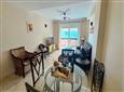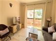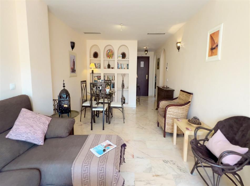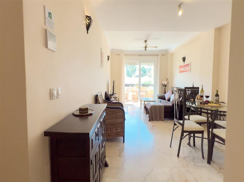 The spacious and bright living-dining area opens to a large terrace with views of the communal pool, providing a peaceful space to relax and unwind.