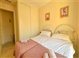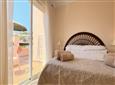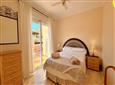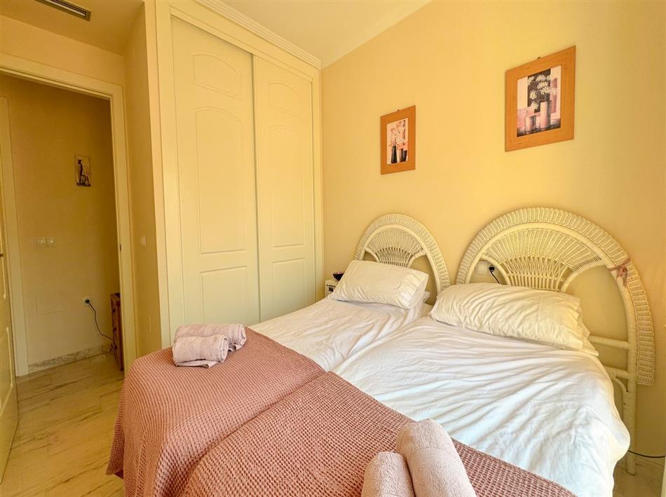 The apartment features two bedrooms: the master bedroom comes with a double bed, an en-suite bathroom with a bathtub and overhead shower, and direct access to the terrace. The second bedroom has two single beds. Both bedrooms offer built-in wardrobes for plenty of storage space.