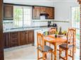 Oven, Hob, Fridge Freezer, Dishwasher, Microwave, Washing Machine, Area with Dining Table and Chairs, Doors to Terrace