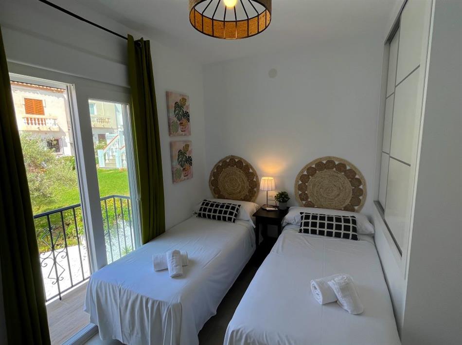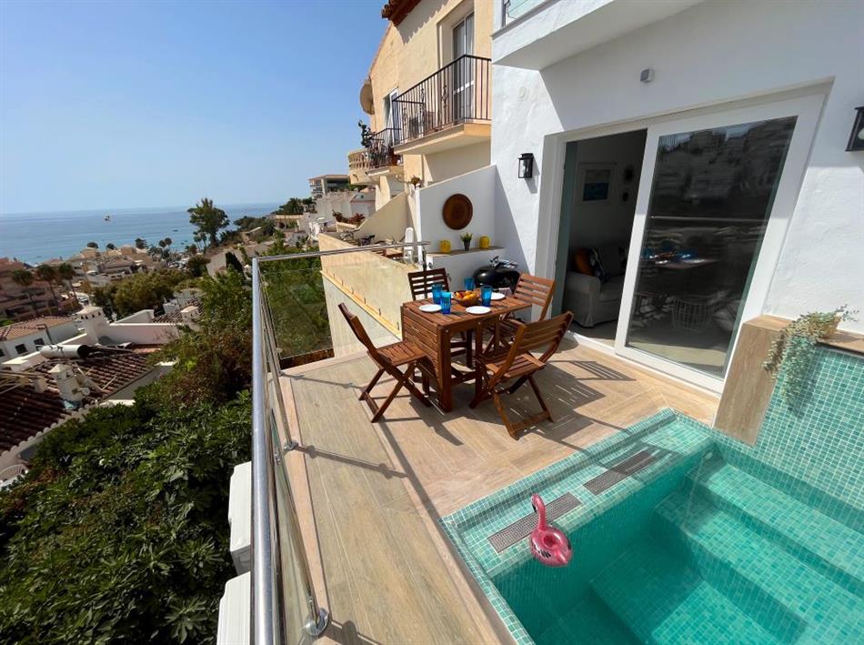 On the ground floor, there is the small twin bedroom with two single beds (80cm x 180cm), a WC and then the open plan kitchen and living area. This living room opens out to the spectacular private terrace with stunning views over Burriana Beach and your very own private HEATED plunge pool (2m x 1m)! Upstairs there is another twin bedroom with two full size single beds and its balcony, a shared shower room with WC and then the master bedroom with king-size bed, ensuite bathroom with twin basins, bath and shower, and a lovely balcony with the same views as from the private terrace.
