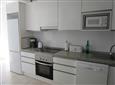 A fully equipped modern style kitchen equipped with a refrigerator, oven, hob, microwave, toaster, blender, coffee maker and dishwasher.